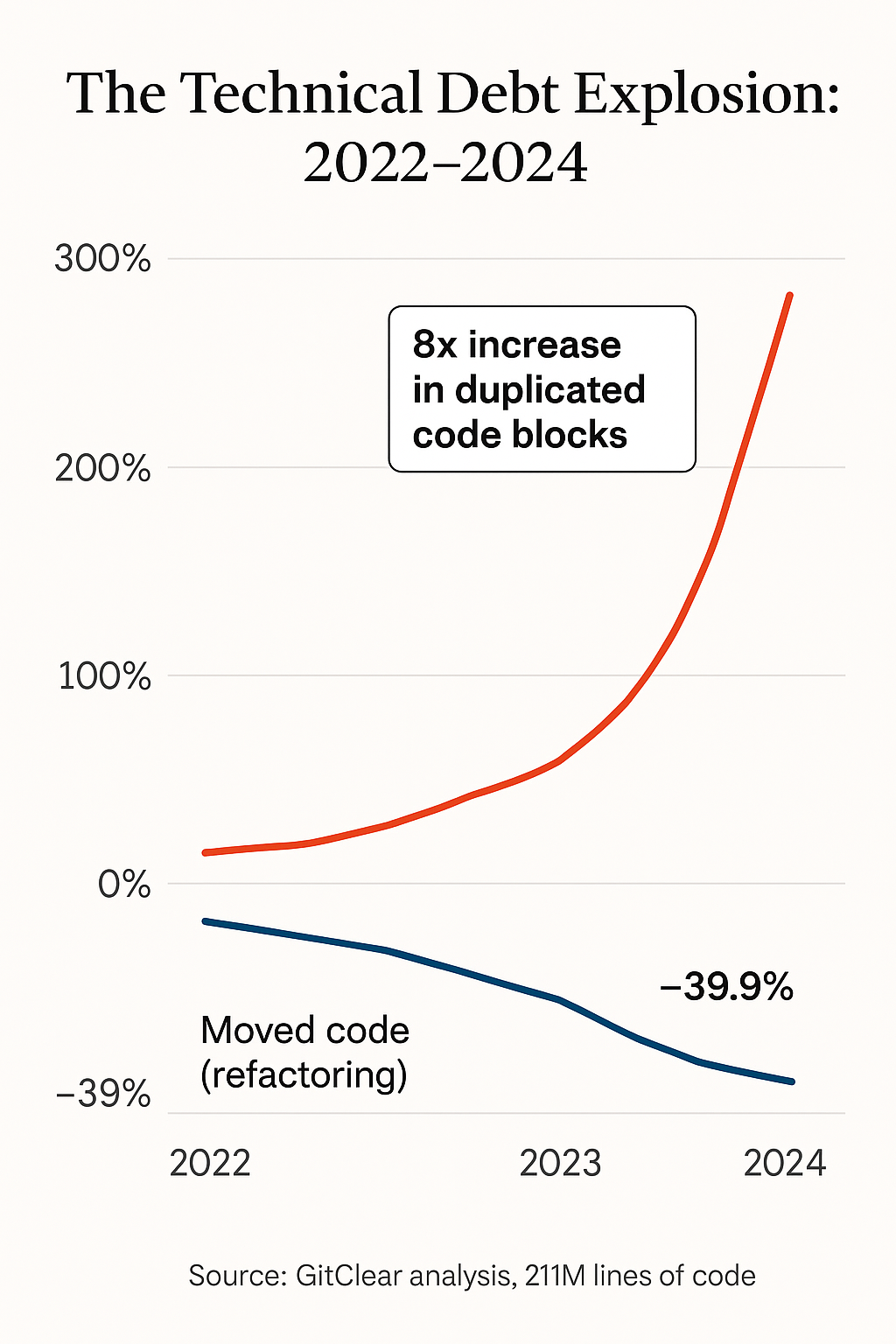 But here’s what the productivity metrics miss: we’re creating technical debt faster than ever recorded in the industry’s history.