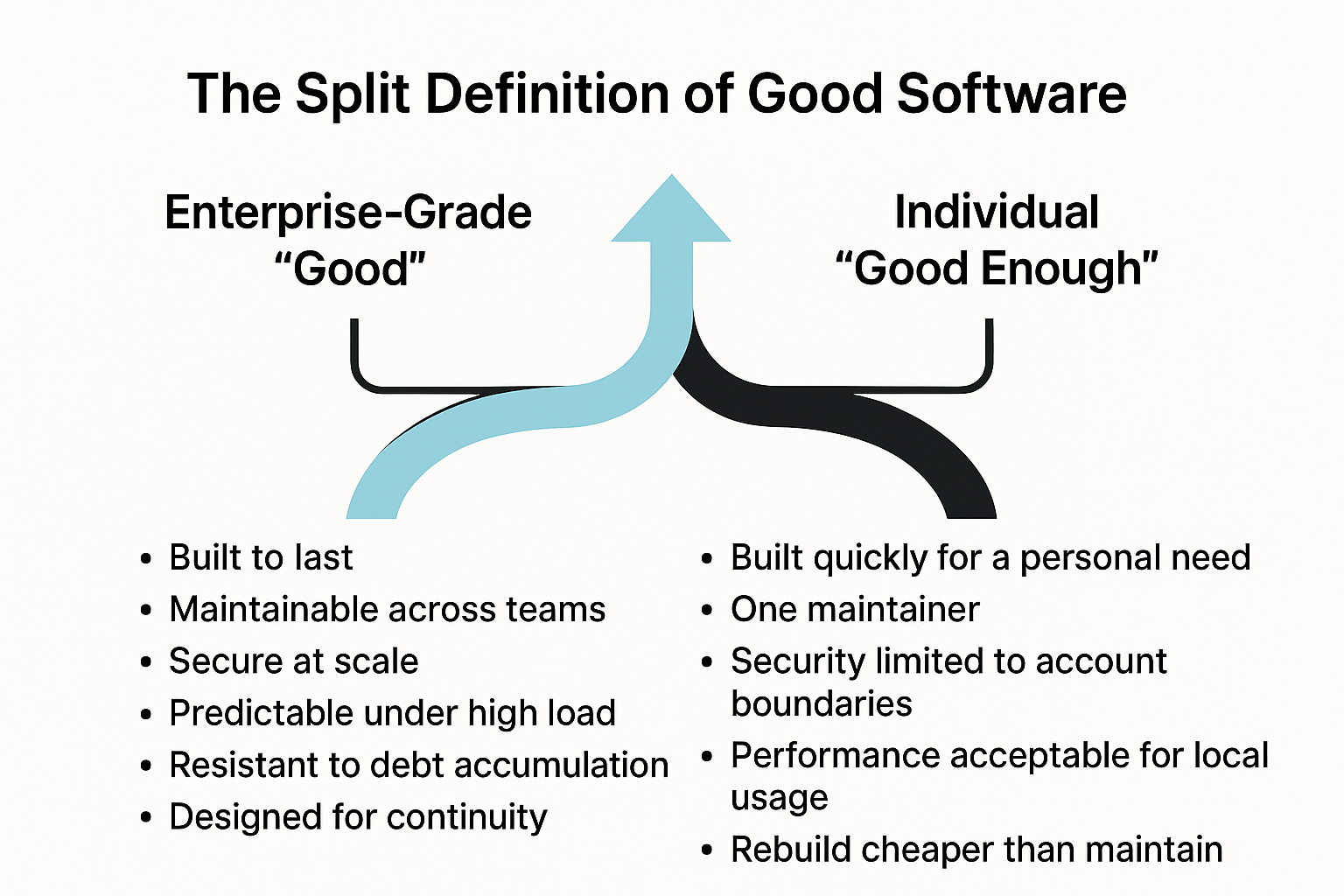 The definition of “good software” has changed. It now contains two incompatible realities: enterprise-grade durability and individual “good enough” disposability. Both matter. Both have value. But they cannot be treated the same.