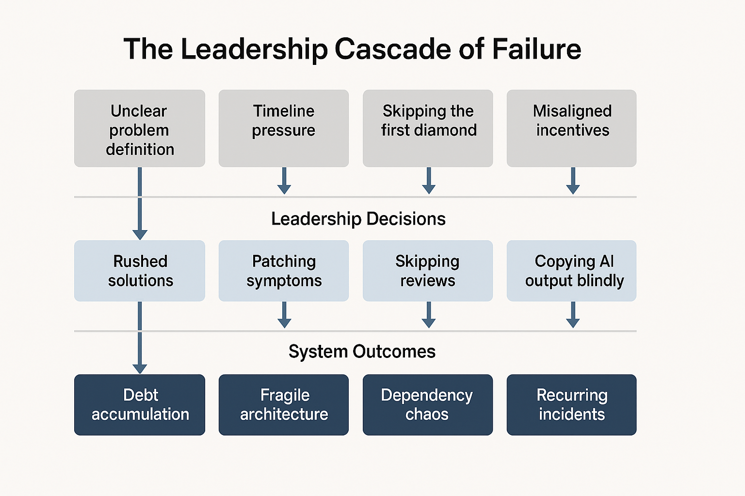 When leaders skip the first diamond, they force teams into blind execution. Velocity increases temporarily. Debt increases permanently.