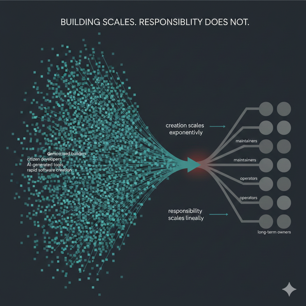 But democratization creates a structural paradox. The number of people who can build software has increased dramatically, but those who can maintain, operate, and evolve it over time have not. In many organizations, this number has declined.