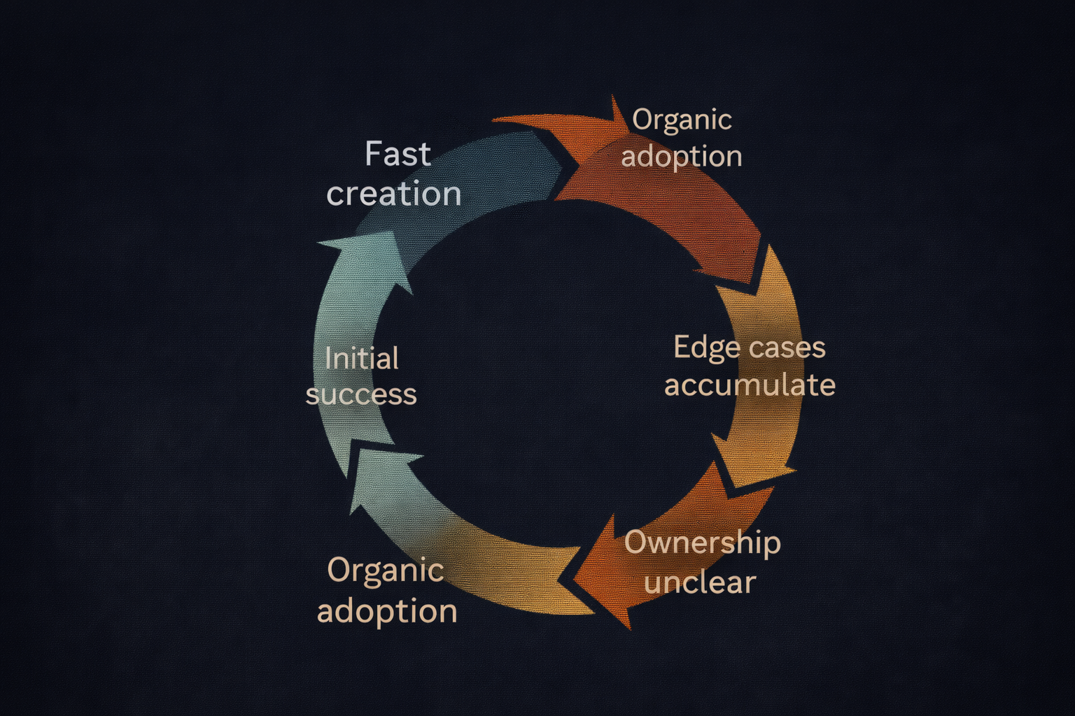 AI has collapsed the cost of initial creation. Features appear quickly. Prototypes feel complete. Internal tools emerge without formal projects or architectural review.